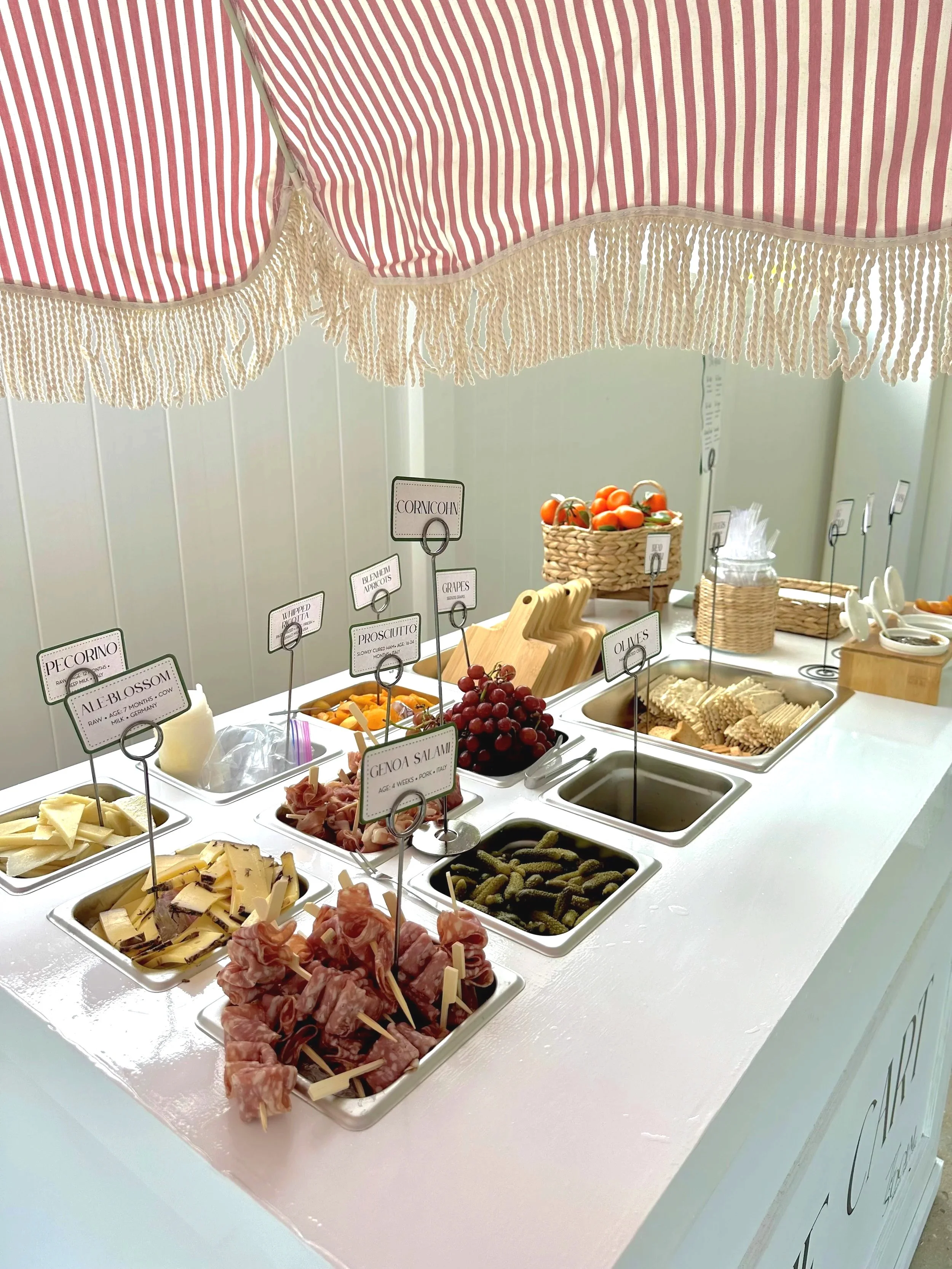 Our carts boast an array of gourmet local and imported delicacies, and are tastefully adorned with personalized menus, fresh flowers, mini boards, and multiple decorative items that are thoughtfully curated to suit your event's aesthetic, while an assigned caterer is on hand to enhance your guest experience. Additionally, unlike conventional grazing tables, our carts are equipped with a cooling system, ensuring that our offerings remain fresh at all times. Relax as our professional staff ensures a white-glove immersive experience.